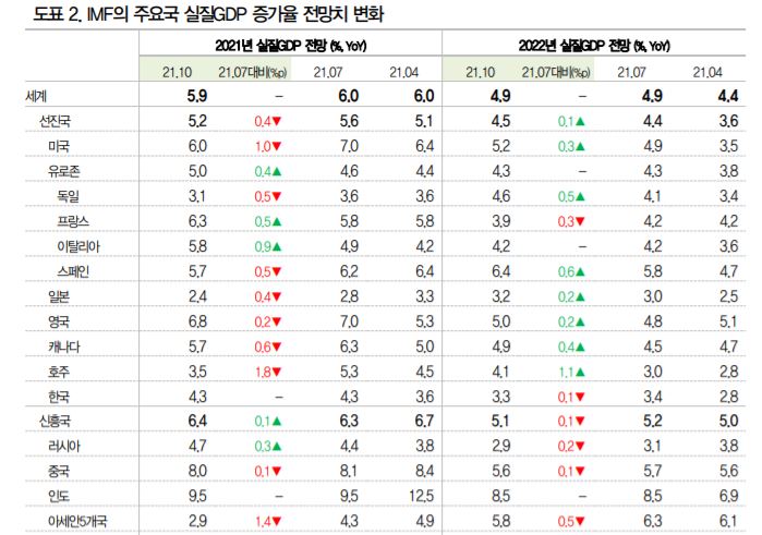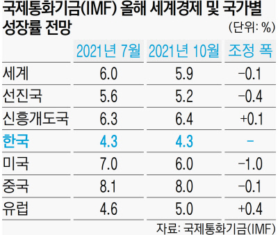 IMF는 글로벌 공급망 차질을 이유로 선진국 성장률 전망치(5.2%)는 이전보다 0.4%포인트 낮췄다. 미국의 경우 1.0%포인트 하향 조정됐다. 중간재 공급 병목 현상을 겪고 있는 독일과 코로나19 긴급사태를 선언한 일본 성장률 전망치도 0.4%포인트씩 낮아졌다.