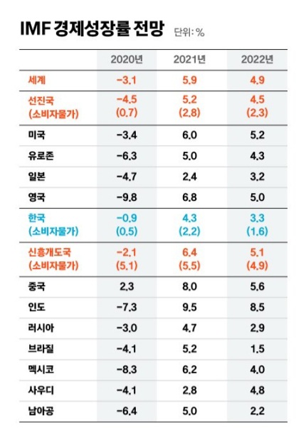 반면 저소득국 성장률 전망치(3.3%)는 0.6%포인트 낮아지면서 불균등한 회복 현상이 심화될 것으로 내다봤다. 내년 성장률 전망치 역시 0.1%포인트 상향 조정되는 데 그쳤다. IMF는 “선진국·신흥국 간 회복 격차가 지속되며 보다 장기화할 것으로 예상한다”고 말했다.