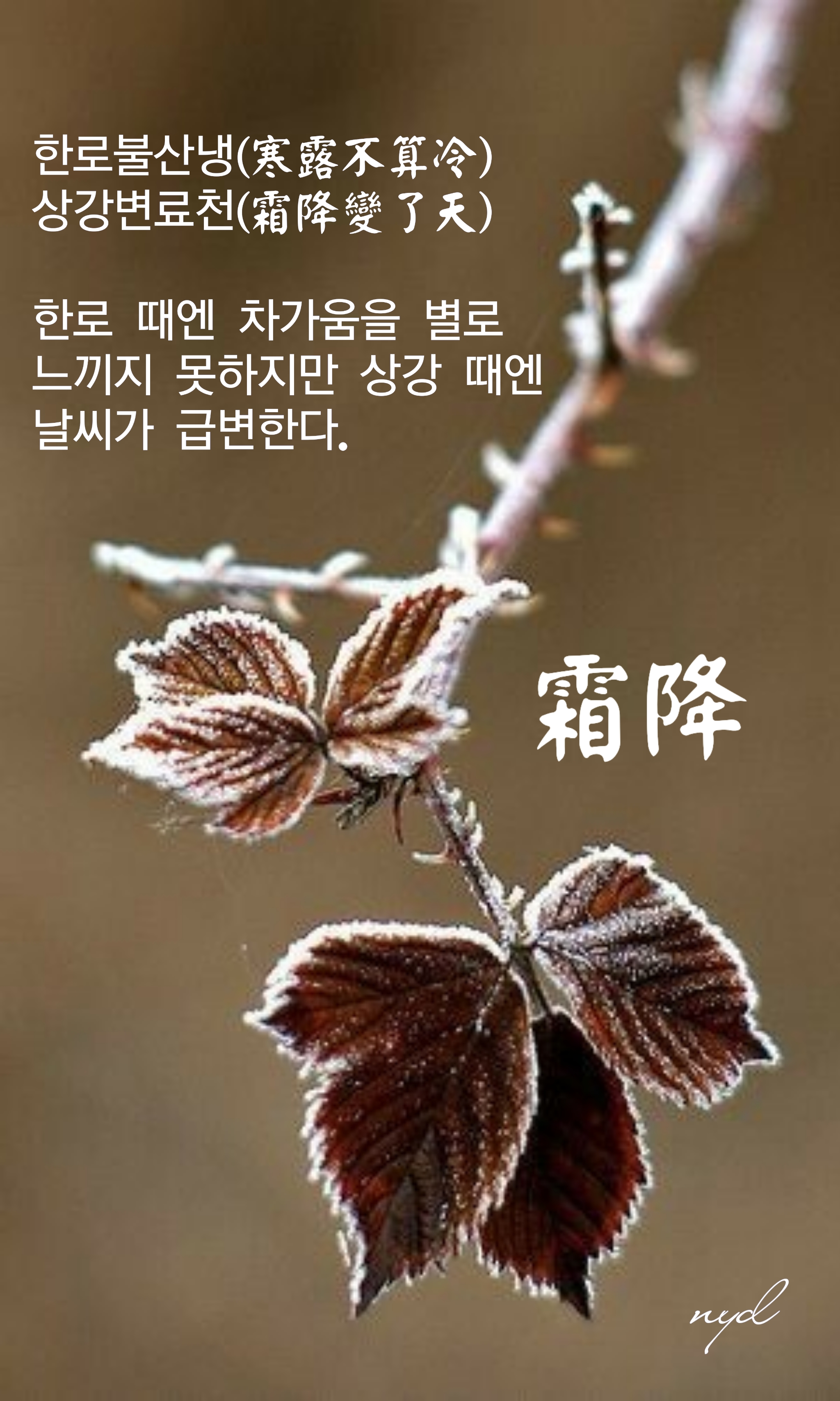 상강(霜降)은 24절기 중 18번째 해당하는 가을의 마지막 절기이다. 가을이 지나고 겨울이 다가오는 것을 알리고 서리가 내리는 시기를 의미한다.