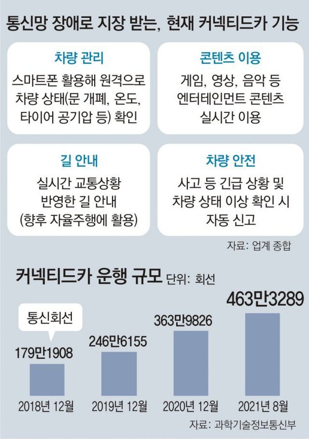 하지만 통신망이 끊기면 이런 기능들은 무용지물이 된다. 업계에서는 현대차, 테슬라가 KT 통신망을 이용하는 걸 감안할 때 10월25일 통신망 불통 사태로 피해를 본 커넥티드 카 가 많았을 것으로 추산한다.