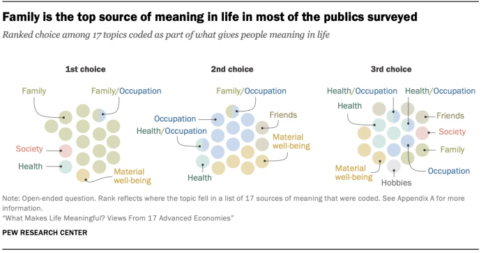 호주, 뉴질랜드, 그리스, 미국에서는 응답자의 절반 이상이 가족을 삶의 중요한 가치로 꼽았다. 퓨리서치센터에 따르면 가족이 삶을 의미있게 만든다는 답변에는 부모, 형제, 자녀, 손자와의 관계, 그들과 함께 보내는 시간에 대한 만족감, 자녀와 친척의 성취에서 얻는 자부심, 자녀들에게 더 나은 세상을 물려주고자 하는 열망 등이 포함된다.