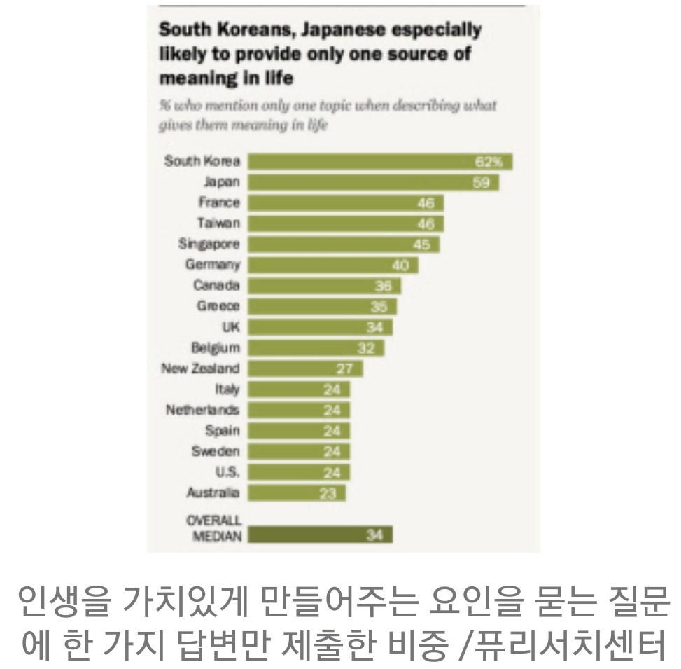 한국인들이 꼽은 순위는 물질적 풍요(19%), 건강, 가족, 지위, 사회 순이었다. 다른 나라에서는 삶에 가치를 부여하는 원천으로 2~3위에 해당하는 직업적 성취를 꼽은 응답자는 6%에 불과했다. 로맨틱한 파트너와의 관계, 친구나 이웃과의 관계 등 인간관계를 꼽는 응답자 비중이 전반적으로 낮았다. 자연 및 야외활동이나 취미가 중요하다고 꼽은 비중도 응답자국 가운데 최하위였다.