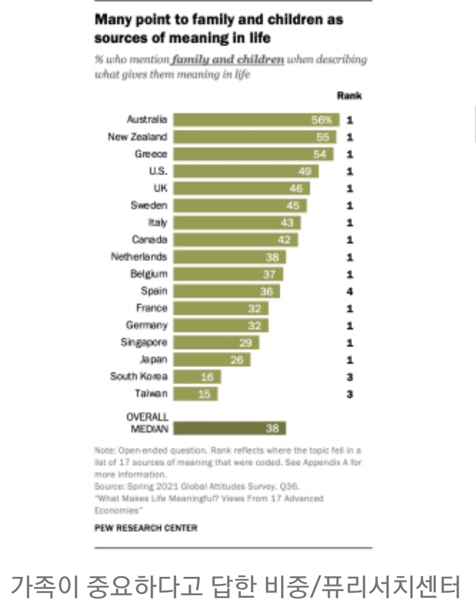 퓨리서치센터는 “삶을 의미있게 만드는 원천 중 한 가지가 압도적으로 우세하다는 사실은 분명했다”며 “조사대상 17개국 가운데 14개국에서 ‘가족과 아이들’을 가장 많이 꼽았다”고 밝혔다.