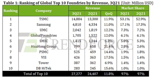 보고서에 따르면 3분기 파운드리 시장 총 매출은 272억7700만 달러(32조5000억원)으로 전기의 244조700만 달러(28조7000억원)보다 11.8% 늘어났다. 트렌드포스는 스마트폰의 전통적 성수기와 함께 노트북과 PC, 네트워킹 장치, 자동차 전자 제품, IoT 장치용 OEM의 지속적인 재고 확대로 수요가 공급을 앞질렀다고 언급했다.