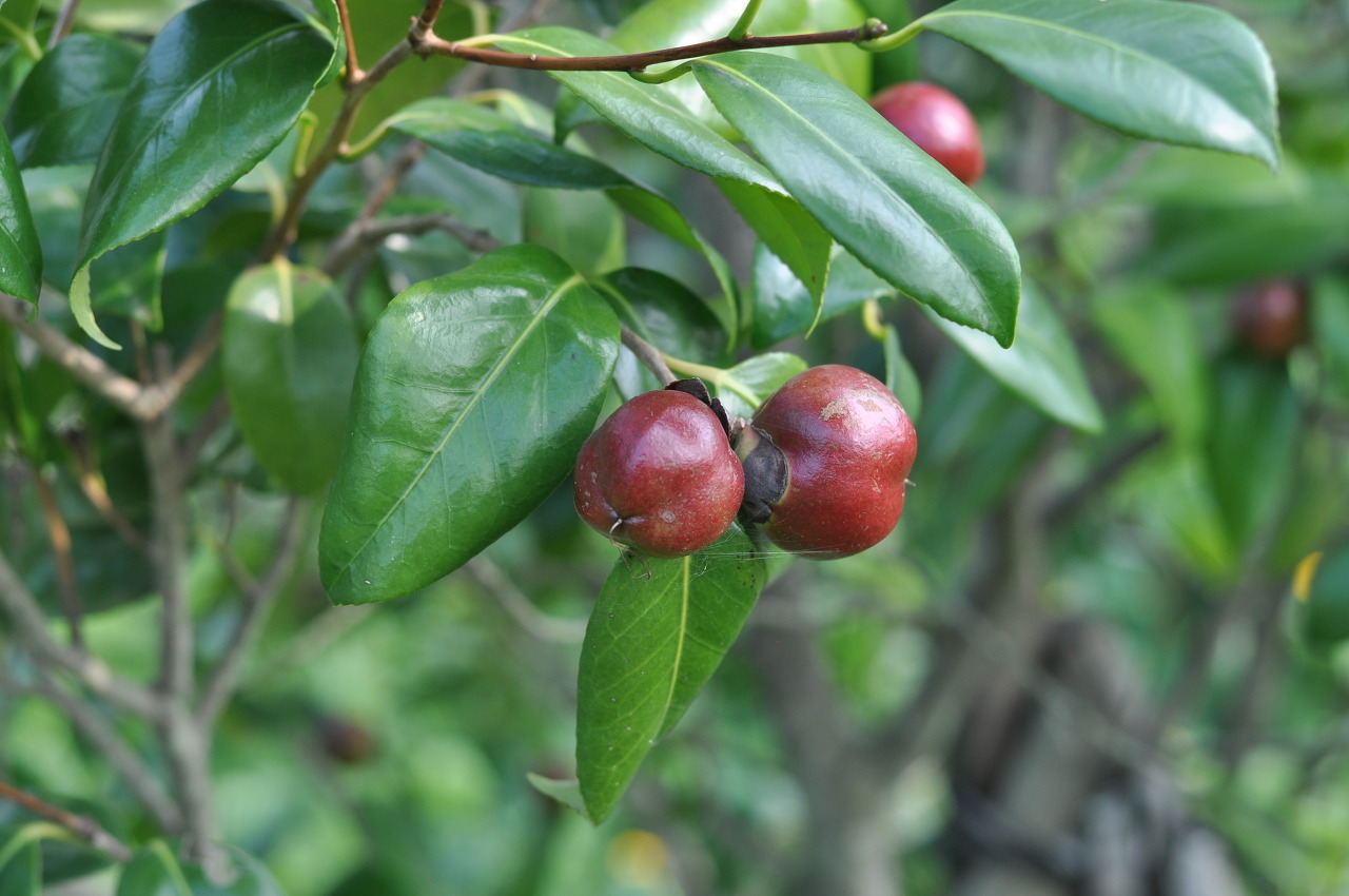 열매는 10월에 영글며, 껍질이 마른 뒤 쪼개지면서 나오는 삭과로서 모양은 둥글고 길이는 2~3cm이며 완전히 성숙된 열매는 3갈래로 갈라지고 그 안으로는 암갈색의 씨가 1~3개 들어있다. 씨는 타원형으로 길이는 약 2cm, 폭은 1.5cm로 배면이 각이 져 있다.