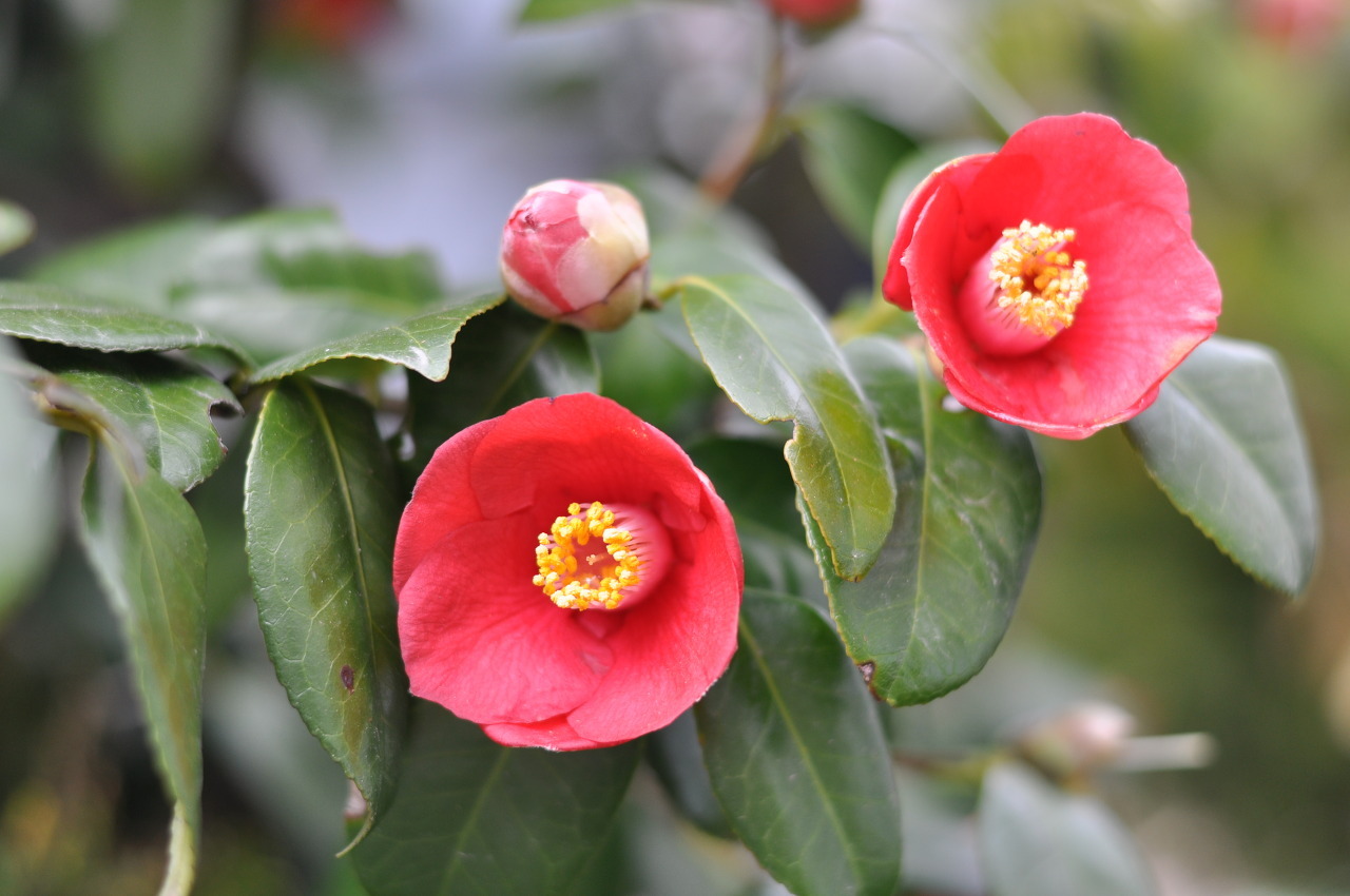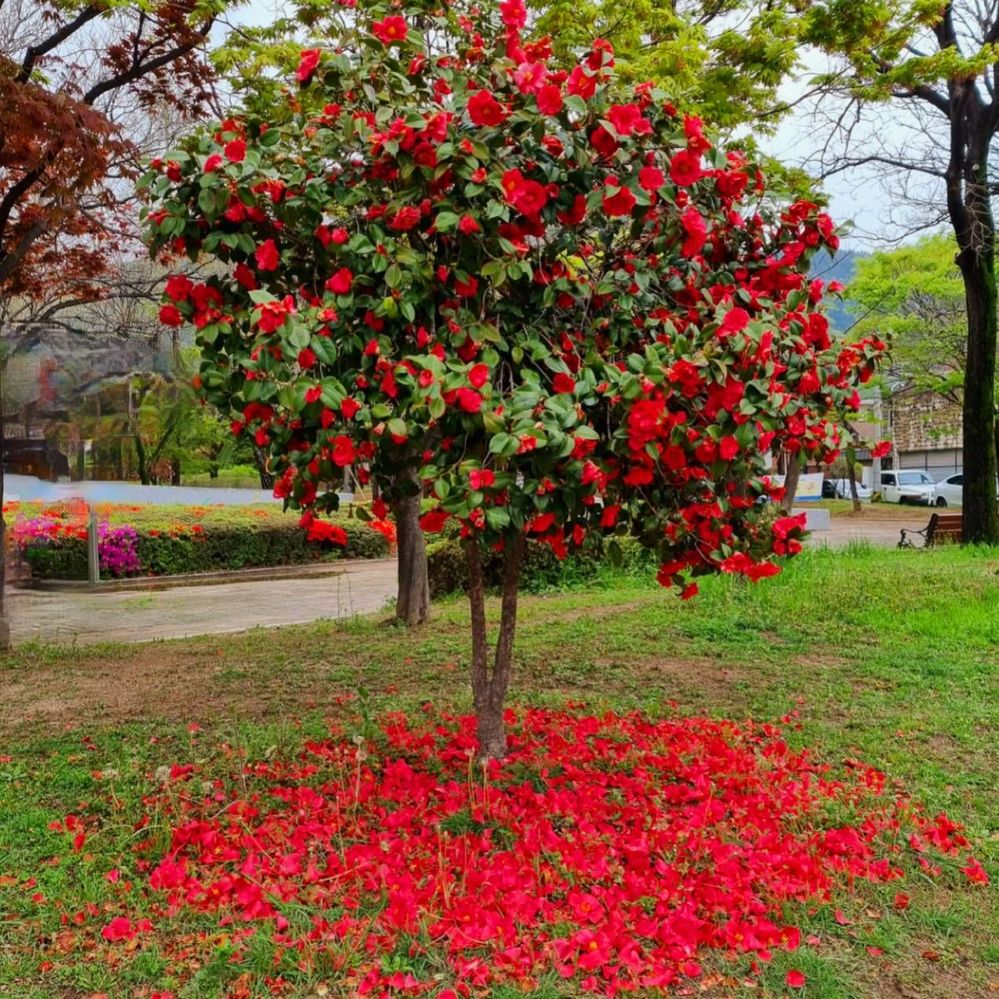 동백나무의 꽃말은 붉은빛의 꽃이 통째로 떨어지는 특성?때문에 모든 걸 다 받치는 사랑 '진실한 사랑'이다.