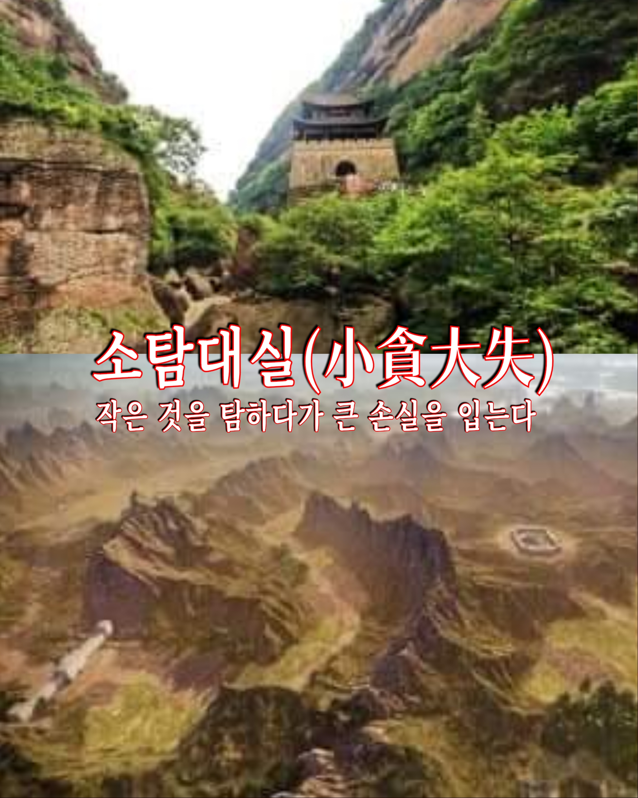 (小 작은 소, 貪 탐낼 탐, 大 큰 대, 失 잃을 실. penny wise and pound foolish)