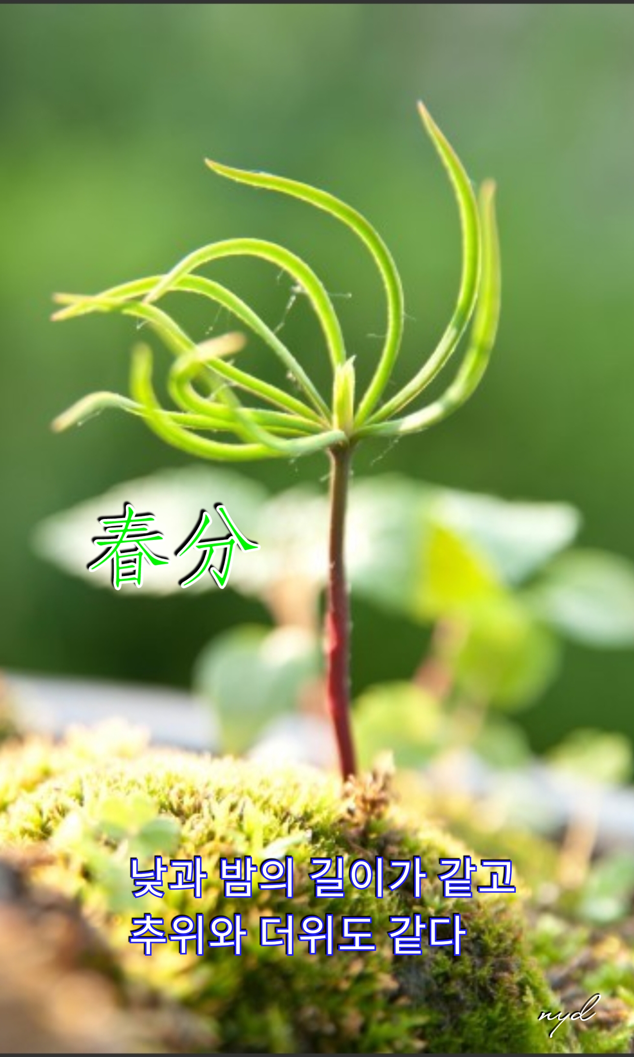 이날 태양이 남쪽에서 북쪽으로 향하여 적도를 통과하는 점, 곧 황도(黃道)와 적도(赤道)가 교차하는 점인 춘분점(春分點)에 이르렀을 때, 태양의 중심이 적도 위를 똑바로 비추어, 양(陽)이 정동(正東)에 음(陰)이 정서(正西)에 있으므로 춘분이라 하는 것이다. 이날은 음양이 서로 반인만큼 낮과 밤의 길이가 같고 추위와 더위가 같다.