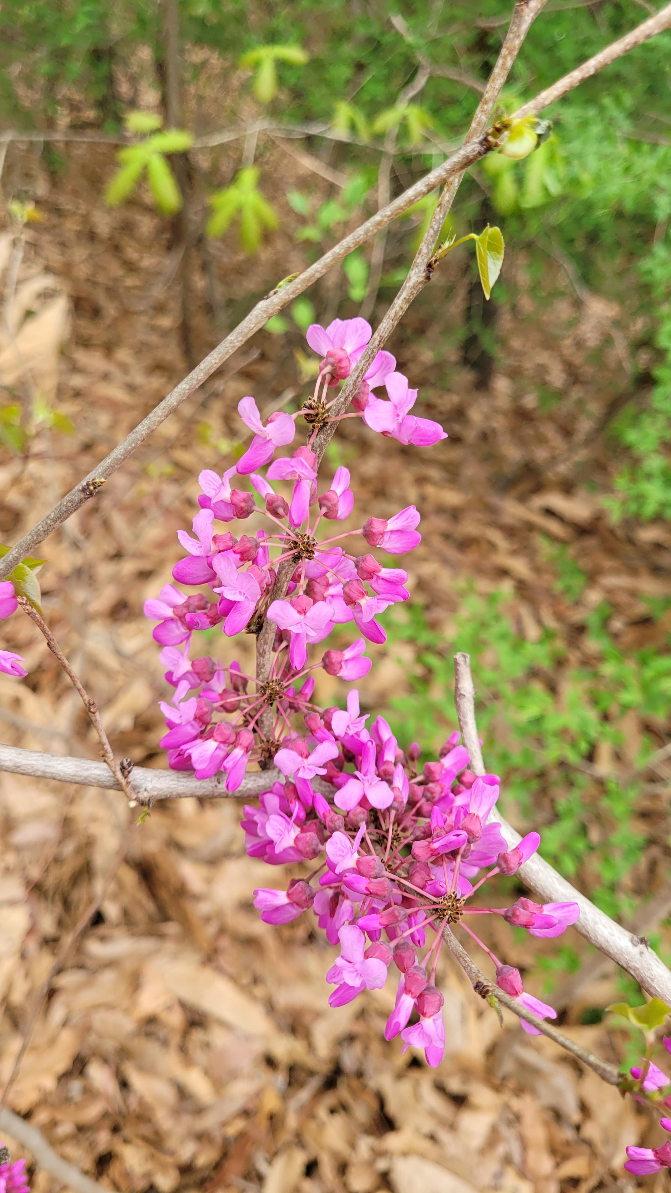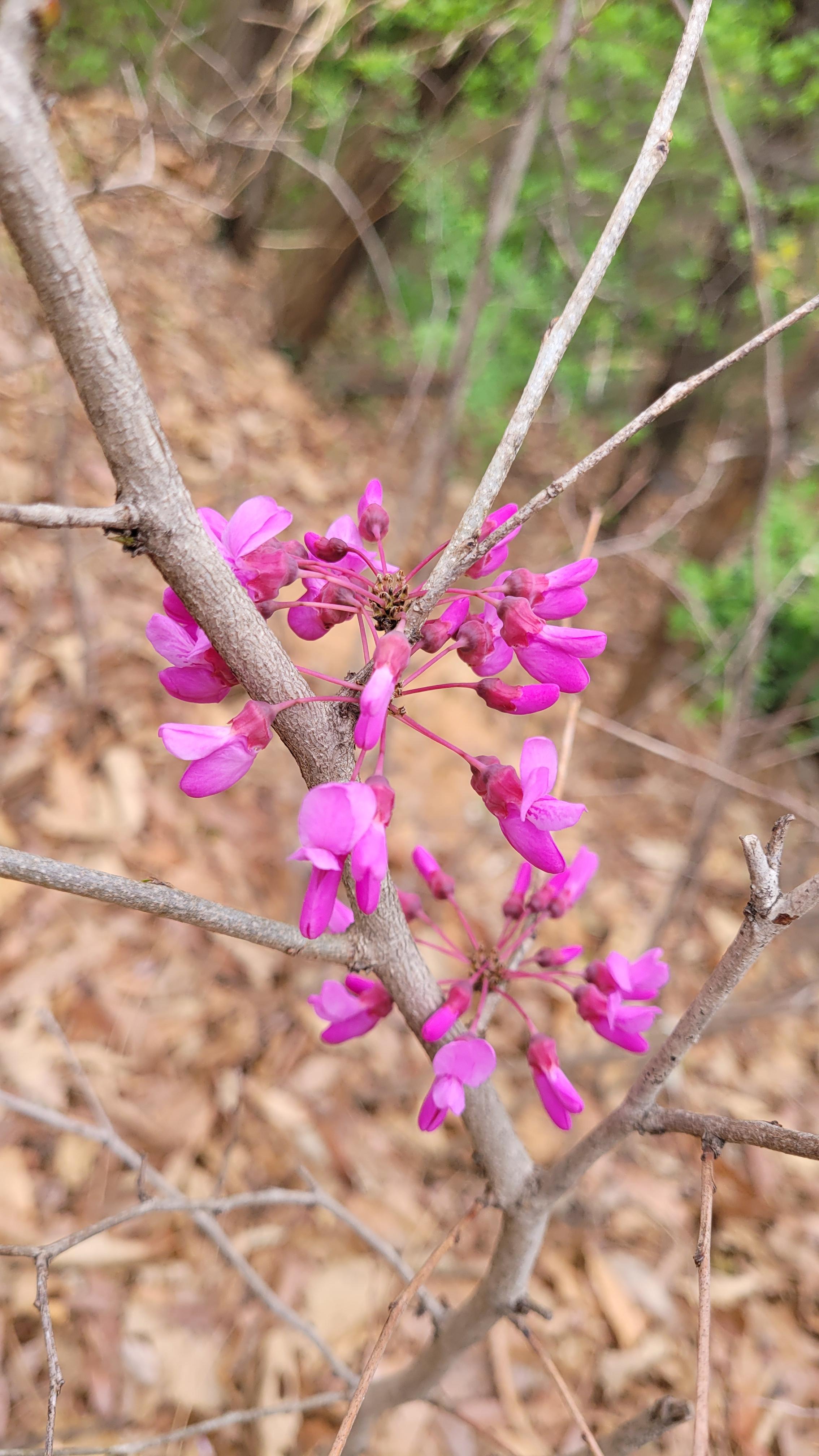 박태기나무는 껍질은 회백색이며 피목이 발달했다. 꽃은 4월하순에 잎보다 먼저 피며 길이 1.2-1.8cm로서 자홍색이고 화경이 없으며 7-8개, 많은 것은 20-30개씩 모여 달려 산형화서를 이룬다. 소화경은 길이 6-15mm로서 꽃받침과 더불어 적갈색이며 털이 없고 2/3정도되는 곳에 마디가 있어 부러지며 기판은 길이 8-10mm이고 용골판(龍骨瓣)은 나비 5mm이다. 수술은 연한 홍색이며 길이 10-12mm이고 암술은 길이 10mm로서 황록색이지만 끝은 적색이다. 꽃은 접형화관으로 자홍색으로 피는데 나무 전체가 꽃방망이처럼 장관을 이룬다.