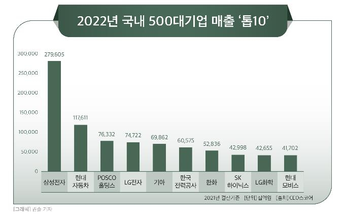 기업별로 보면 삼성전자(279조6천48억원)와 현대자동차(117조6천106억원)가 1위와 2위를 유지했고, 포스코홀딩스(옛 포스코)가 76조3천323억원으로 6위에서 3위로 올라섰다.
