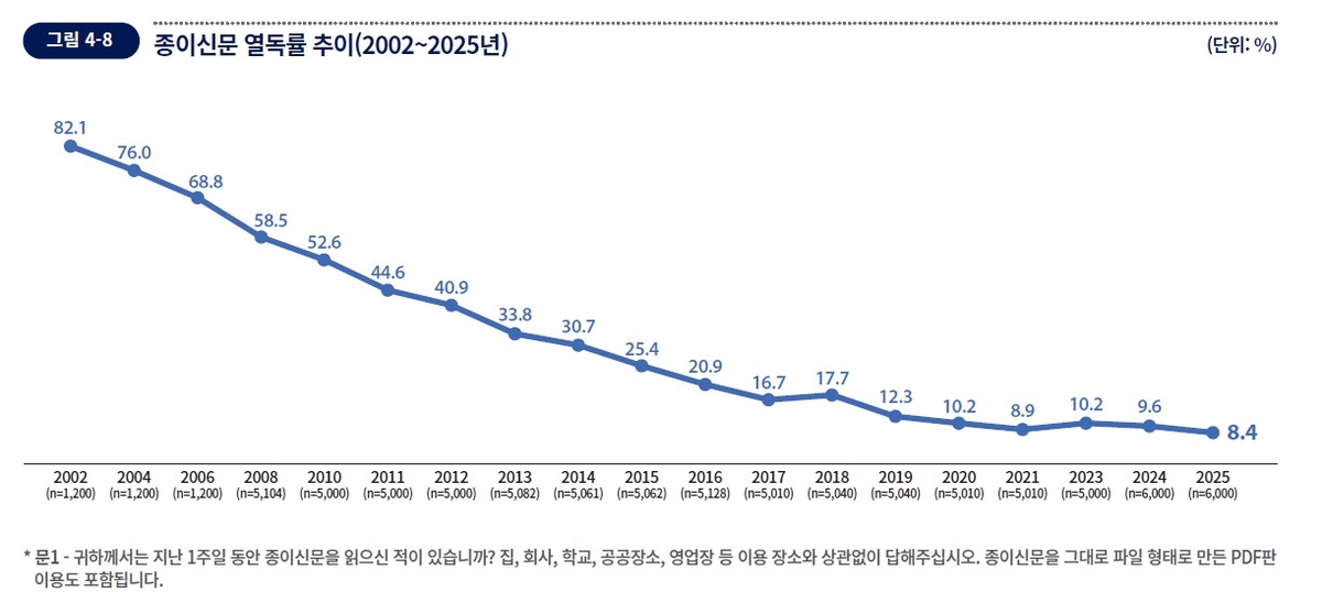 반면 지난 일주일간 종이신문 기사(PDF 포함)를 1건 이상 읽은 이용자의 비율인 종이신문 열독률은 8.4%로, 전년 대비 1.2%포인트 줄며 역대 최저로 추락했다.