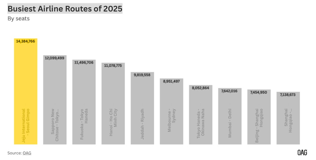 무디 데이빗 리포트는 1월12일 영국 항공 데이터 회사 OAG의 보고서 내용을 발표했다. 이에 따르면 제주-김포 노선이 2025년 1440만 개의 좌석으로 전년에 이어 다시 한번 세계에서 가장 바쁜 국내 노선으로 조사됐다고 밝혔다.