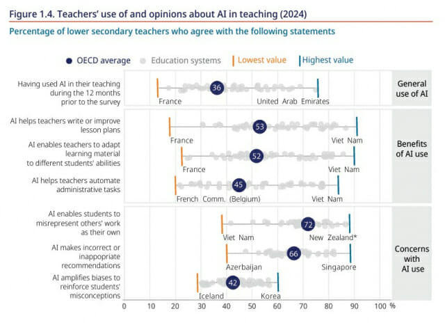 학생들과 달리 선생님들의 AI 사용률은 훨씬 낮다. OECD가 조사한 결과 중학교 선생님의 36%만 최근 1년간 AI를 썼다고 답했다. 나라별로도 차이가 크다. 싱가포르와 아랍에미리트에서는 75%가 쓰는 반면, 프랑스와 일본은 20%도 안 된다.