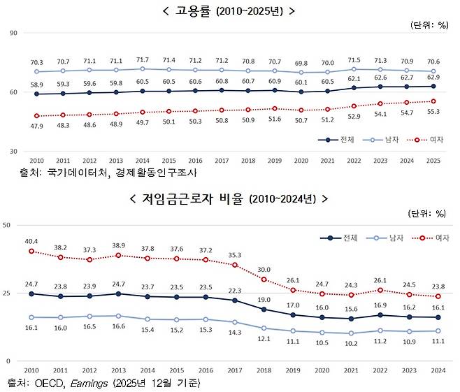 주거와 고용 지표도 일부 악화했다. 2024년 최저주거기준 미달 가구 비율은 3.8%로 전년보다 0.2%포인트 증가했다. 대학졸업자 취업률은 69.5%로 전년보다 0.8%포인트 하락했다. 코로나19 영향으로 2020년 65.1%까지 떨어졌던 취업률은 이후 3년 연속 상승해 2023년 70.3%까지 회복했지만 다시 감소했다.