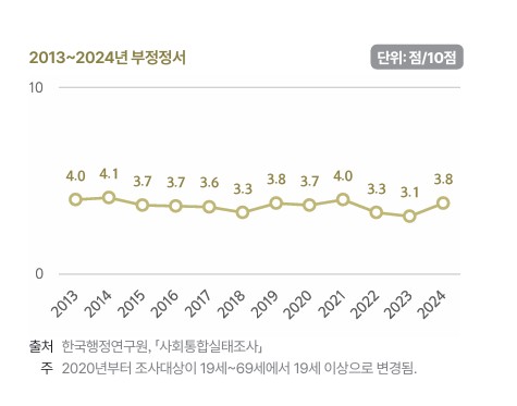 우울과 걱정을 나타내는 부정정서는 2024년 3.8점으로 전년보다 0.7점 상승했다. 부정정서는 2022년 4.0점 이후 감소세를 보였지만 3년 만에 다시 악화했다. 연령이 높고 소득이 낮을수록 부정정서가 높은 경향도 확인됐다.