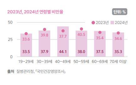 보고서는 특히 40대의 건강과 삶의 질 지표 악화를 지적했다. 2024년 40대 비만율은 44.1%로 전년보다 6.4%포인트 상승하며 전체 평균 38.1%를 크게 웃돌았다. 같은 기간 20대는 0.1%포인트 감소했고 30대는 1.9%포인트, 50대는 2.5%포인트 각각 하락한 것과 대비된다. 60세 이상은 1.7%포인트 상승했다.