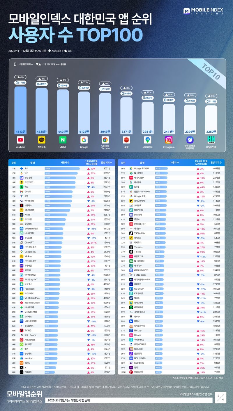 아이지에이웍스 모바일인덱스는 1월8일 ‘2025 대한민국 모바일 앱 순위’ 리포트를 발표했다.이에 따르면 지난해 1월부터 12월까지 유튜브의 평균 MAU는 4813만명이었다. 이어 카카오톡의 평균 MAU는 4635만명, 네이버는 4494만명으로 뒤를 이었다. 한 해 동안 챗GPT 신규 설치 건수는 1600만건을 넘어서며 생성형 인공지능(AI) 앱의 무서운 상승세가 도드라진 해였다.4·5위는 구글(4128만명)과 구글의 브라우저앱인 크롬(3943만명)이 올랐다. 특히 구글 앱은 지난해 12월 MAU가 1월 대비 12% 증가했다.6위는 연간 평균 MAU 3371만명을 기록한 쿠팡으로, 개인정보 유출 논란에도 불구하고 1월 대비 12월 MAU가 8% 증가한 것으로 나타났다. 서비스 고도화에 나선 네이버지도 앱..
